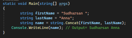 we can also use string.Concat() method to combine two strings